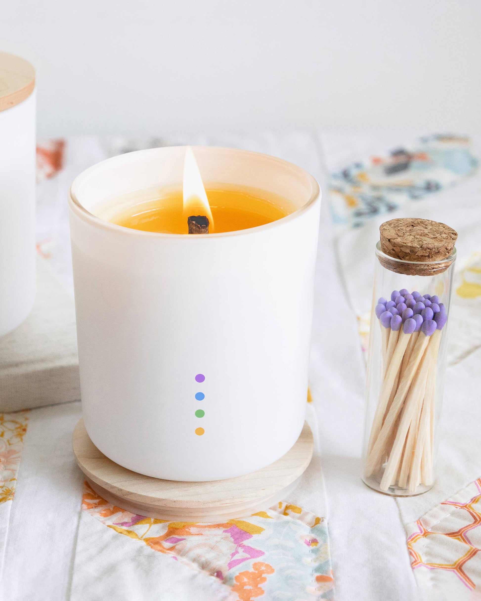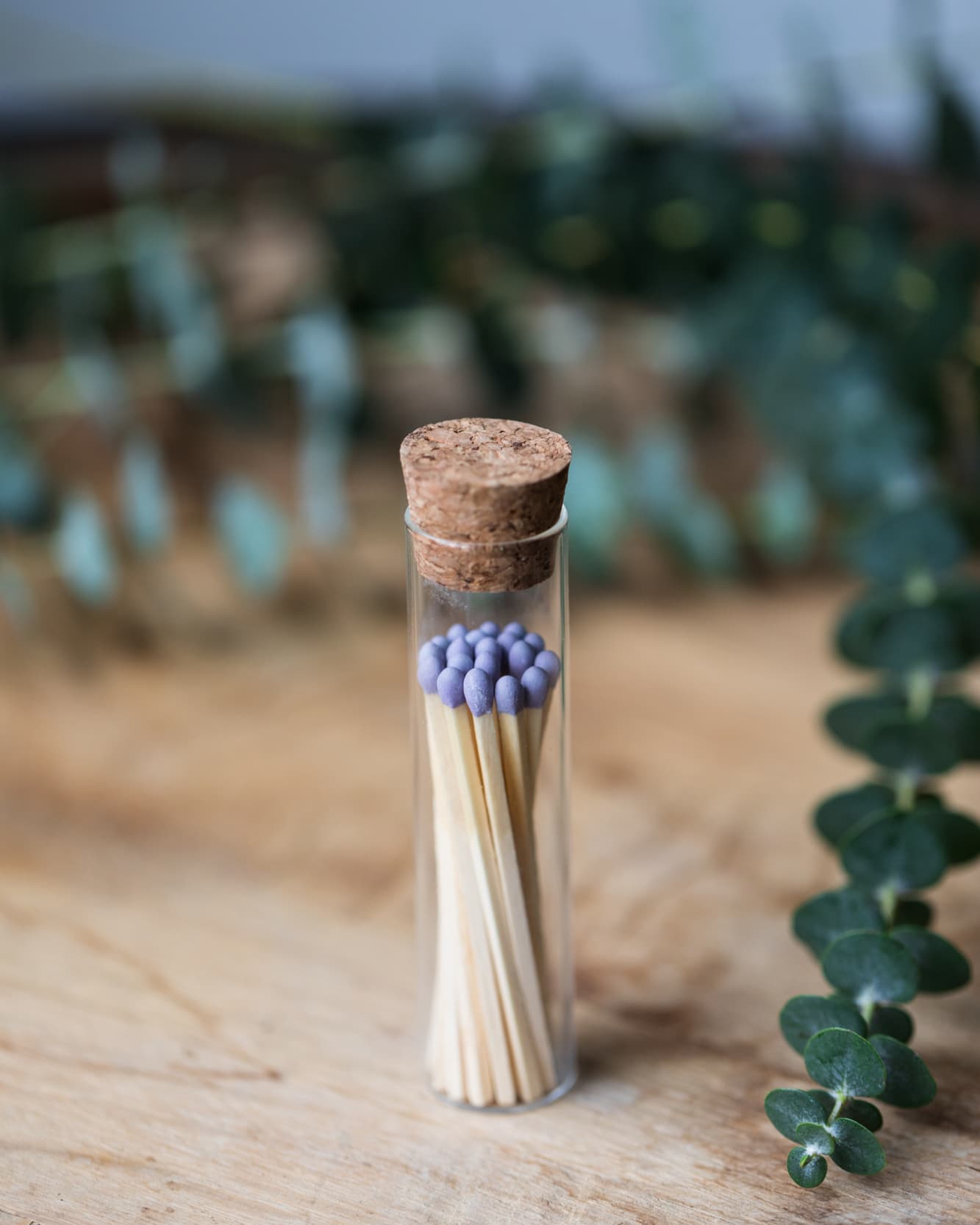 31 x 3" lilac-tipped wood matches in a glass vessel with cork top