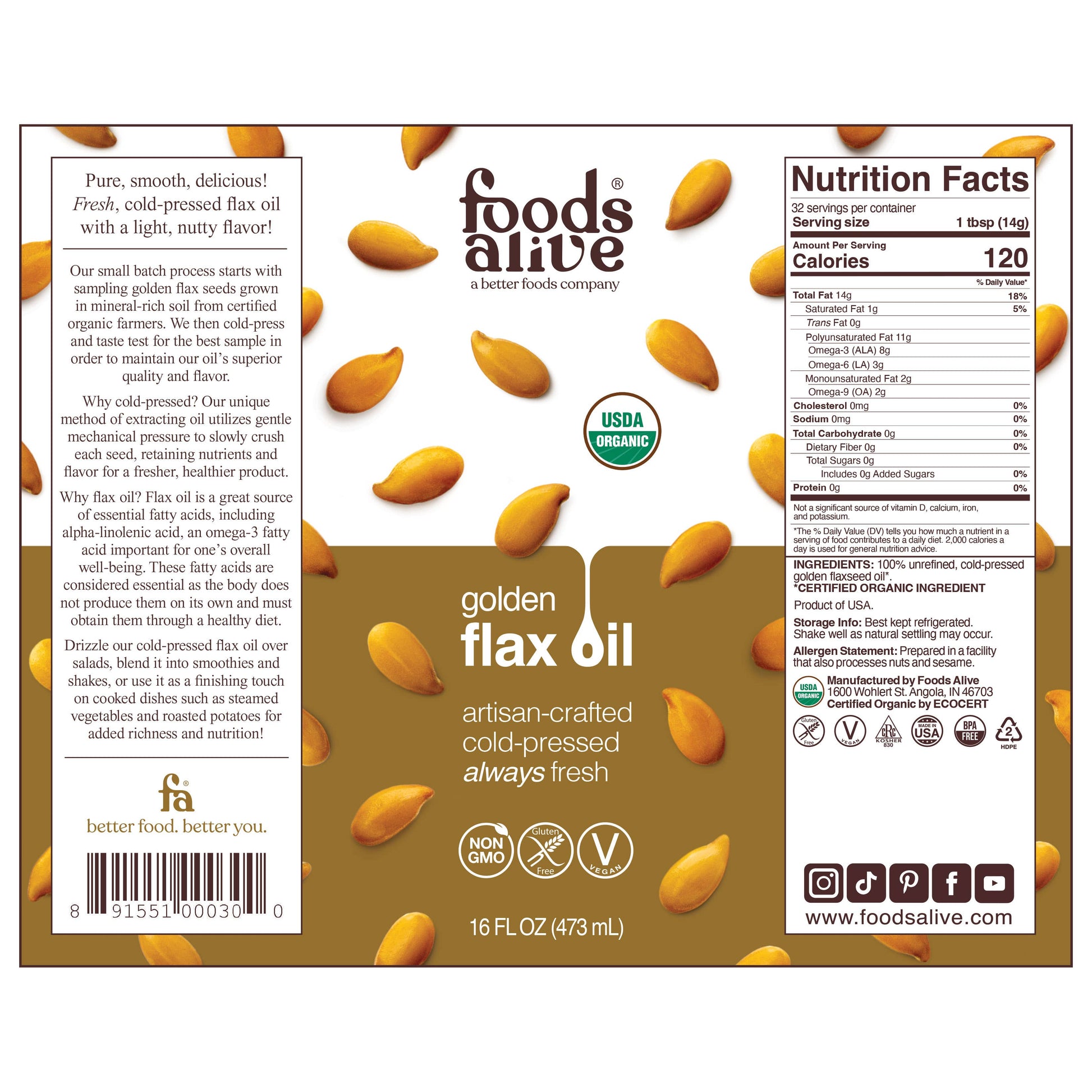 Golden flax oil is a rich source of heart-healthy omega-3 fatty acids and nutrient-rich lignans. Providing a fresh and buttery flavored oil, our small batch process starts with sampling golden flax seeds grown in mineral-rich soil from certified organic farmers. Before purchasing the seed we taste test for that smooth buttery flavor to ensure you are getting a clean quality product. This extra attention to detail allows us to maintain the superior quality you have come to expect from Foods Alive.