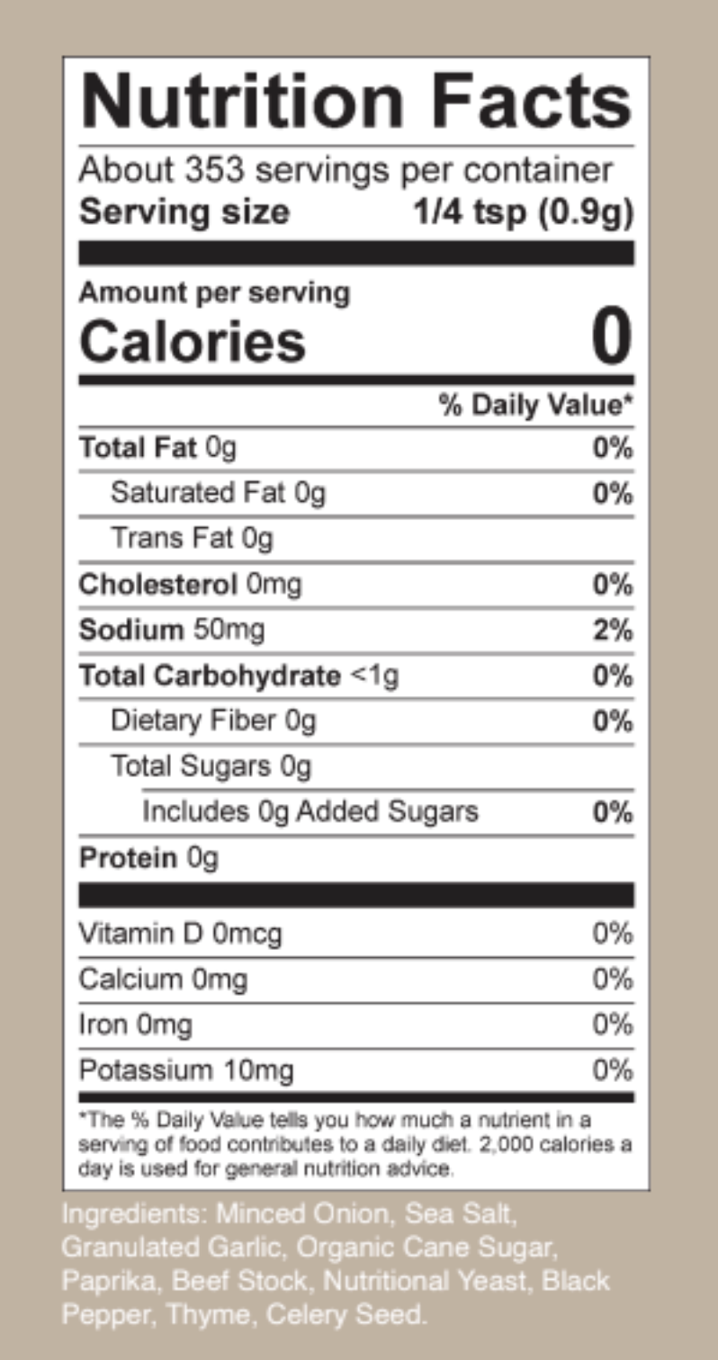 Introducing the cleanest Onion Soup Mix on the market! It wasn't until my first Super Bowl party after my Celiac Disease diagnosis that I reached to eat the chips and dip and realized I couldn't. Regular Onion Soup Mix is not gluten-free. I couldn't believe it. I then searched online for the next few weeks to find a gluten-free option I could keep on hand, but I quickly realized I didn't like any of them I found, so I created my own. Onion soup mix is such a staple in so many recipes. I grew up eating the same store-bought kind as everyone else, so when I set out to create my own, I wanted to keep the familiar flavor we all love but make it gluten-free, dairy-free, and clean-label for those of us who have food allergies and sensitivities. We created a custom bouillon mix since all bullion mixes had extra additives like palm oil, yeast extract, or soybean oil. We wanted to be as allergy-friendly as possible. Lastly, my bottles are big and versatile enough to add rich onion soup mix flavor to burgers, roast, and dips without palm oil or soy