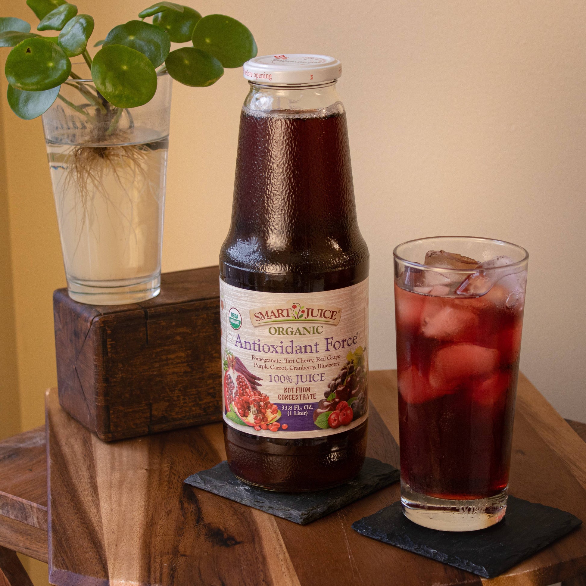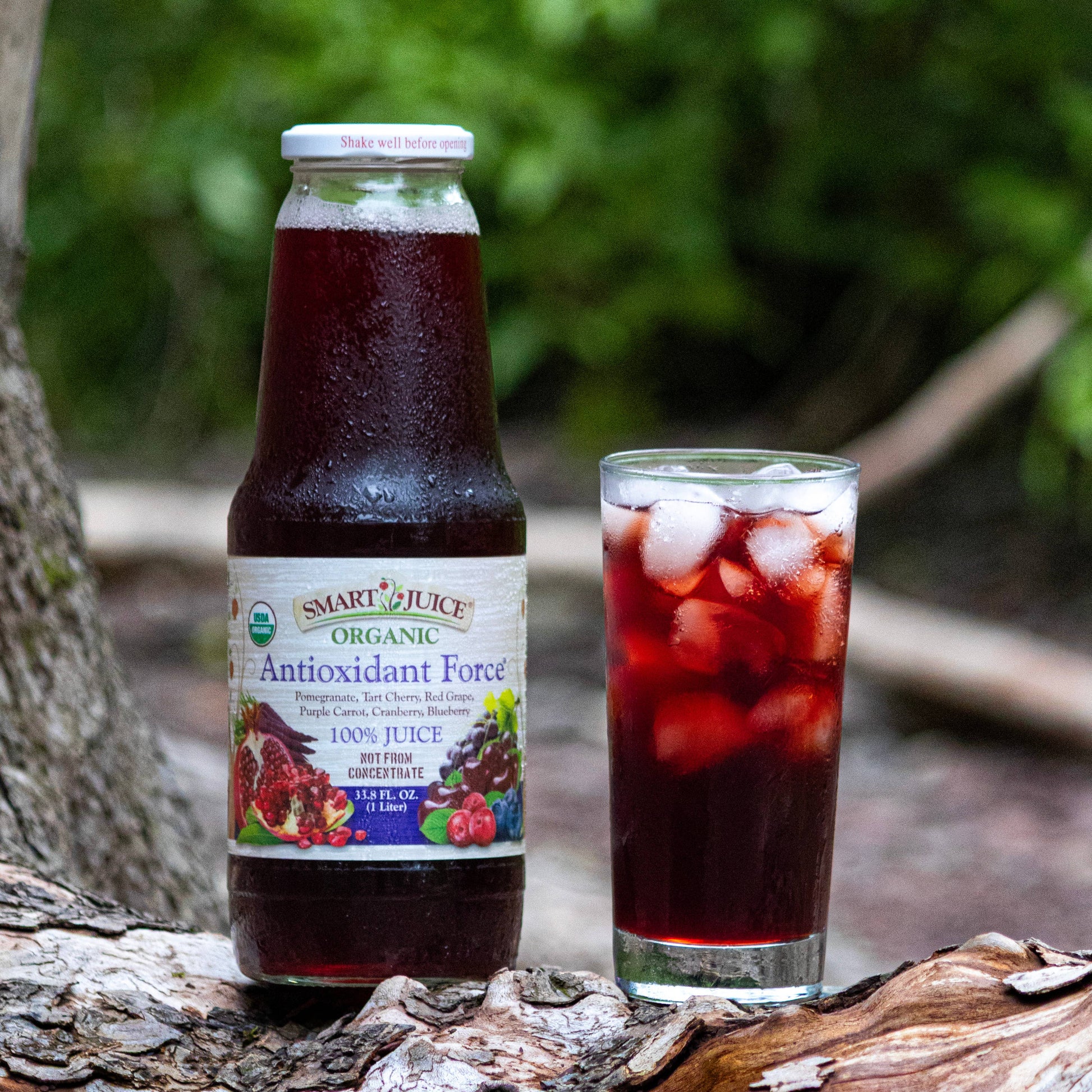 100% organic Antioxidant Force Juice Blend. Not from concentrate, non-GMO, no artificial flavors, preservatives, or colors.