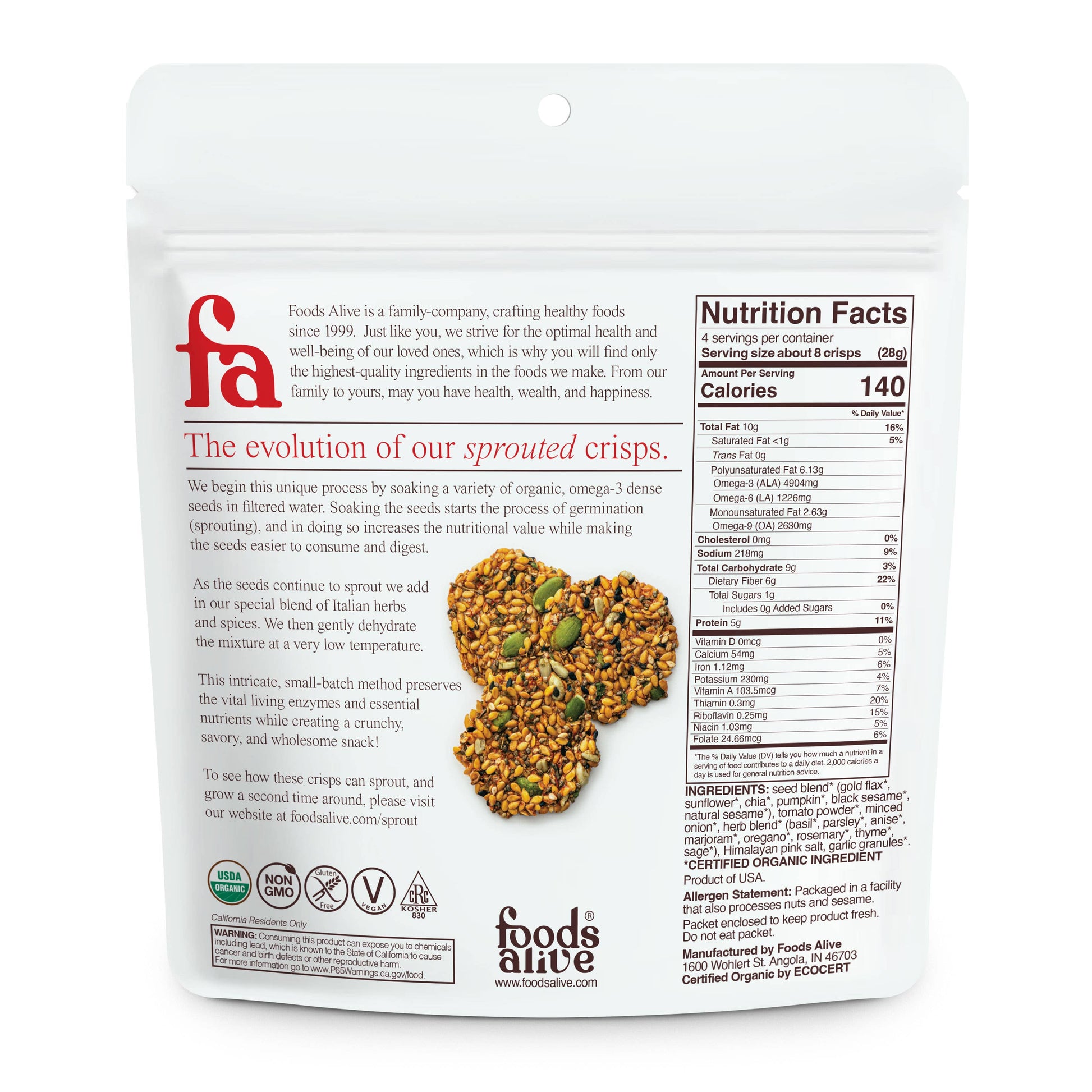 With superior taste, texture, and clean plant-based organic ingredients you are sure to love our updated sprouted crisps. Since these crisps contain fiber and protein, they are the perfect snack to give your body the energy and nutrition it's looking for.